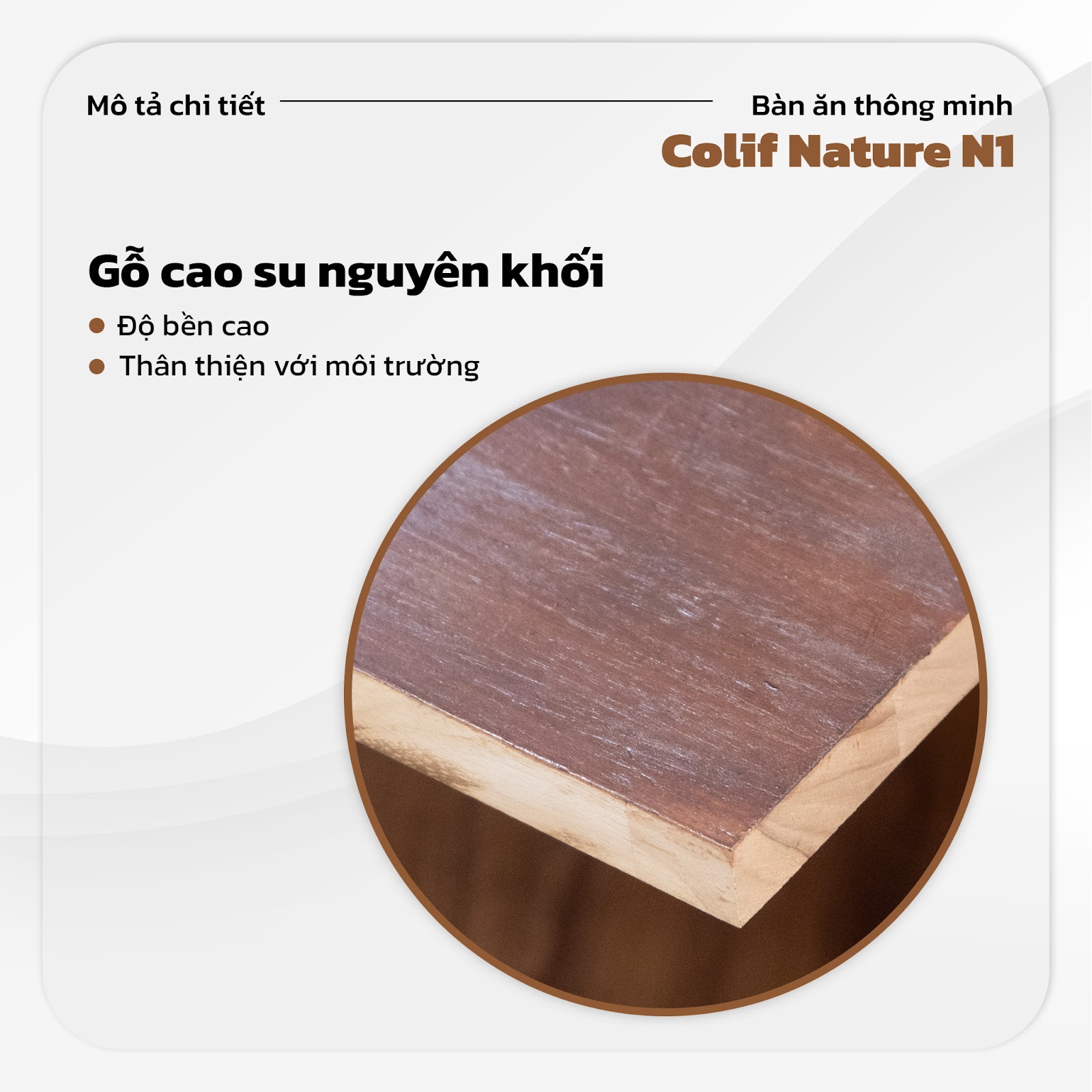 Bàn ăn đa năng Colif Nature N1 làm từ 100% gỗ cao su nguyên khối, đặc điểm nổi bật của loại gỗ này là có độ chắc chắn và bền bỉ cao, không thấm nước và thân thiện với môi trường.
