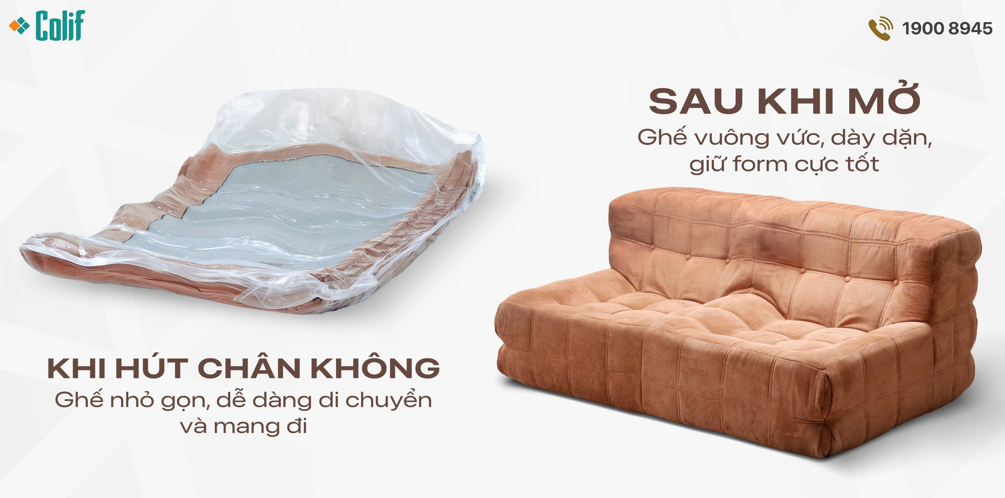 Một điểm khác biệt của Colif Air Sofa chính là công nghệ hút chân không. Không còn lo ngại về việc vận chuyển những chiếc ghế cồng kềnh qua cầu thang hẹp hay vào căn hộ nhỏ. Nhờ công nghệ hút chân không, Colif Air Sofa được nén gọn chỉ trong vài phút, giúp việc di chuyển trở nên nhẹ nhàng và thuận tiện hơn bao giờ hết.
