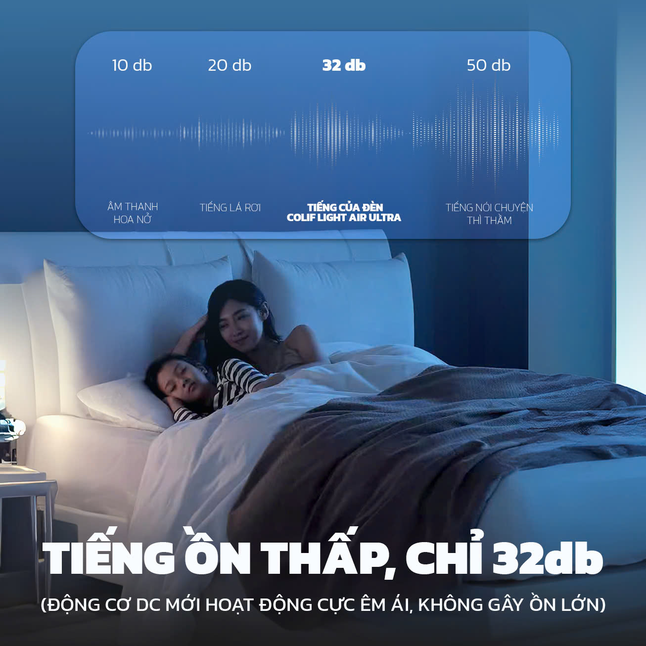 Colif Light Air Ultra sử dụng động cơ đồng nguyên chất cùng công nghệ hiện đại, giúp quạt không gây tiếng ồn lớn, tùy theo chế độ gió lưuạ chọn, âm thanh chỉ khoảng 30 - 50db.