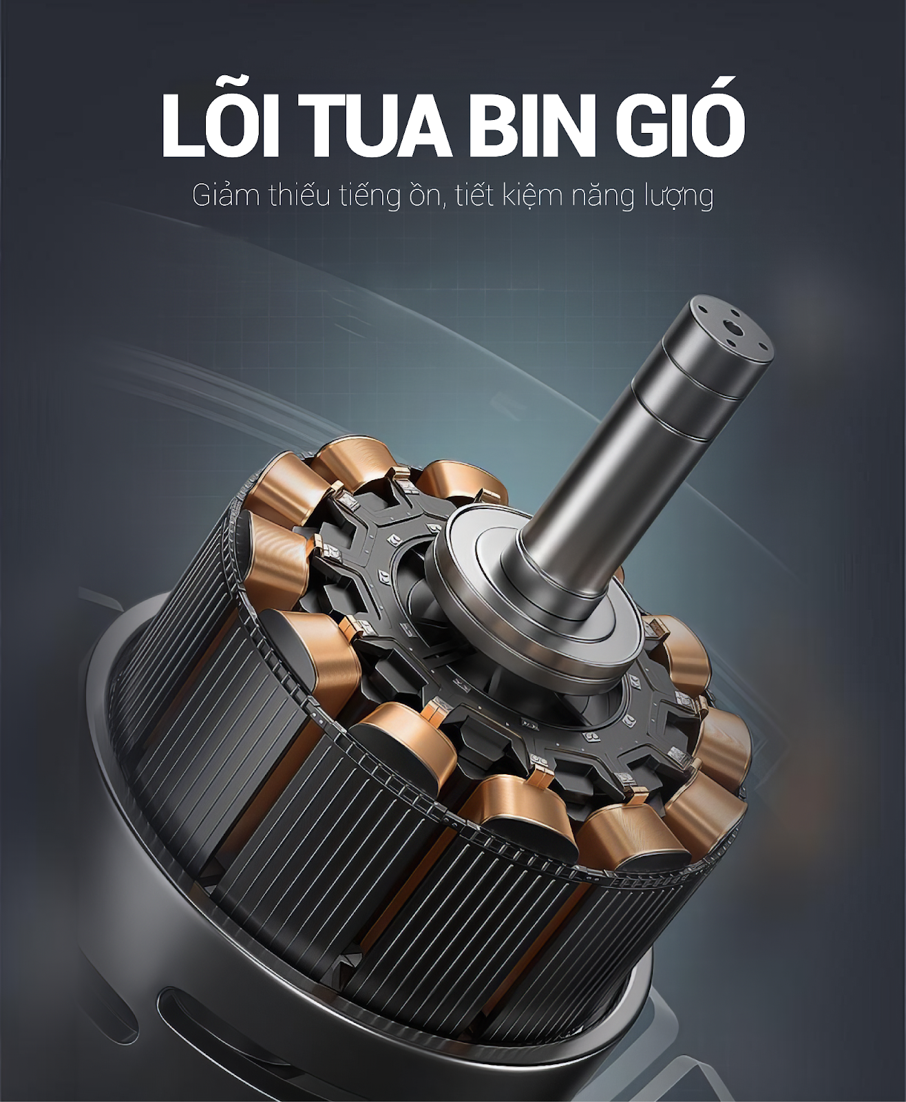 Lõi tuabin gió giúp giảm thiểu ma sát và tiếng ồn, đảm bảo quạt hoạt động êm ái, không gây ảnh hưởng đến sinh hoạt hàng ngày. Lõi tuabin giúp tối ưu hóa luồng gió, cung cấp luồng gió mạnh mẽ nhưng vẫn tiết kiệm năng lượng.