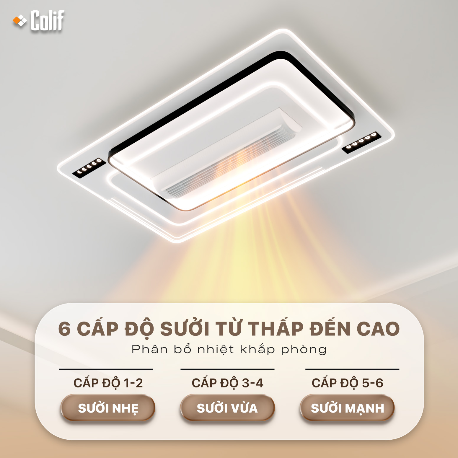 Đèn quạt trần không cánh Colif Rylai có thể tùy chỉnh 6 cấp độ sưởi tùy theo nhu cầu. Với 3 chế độ sưởi nhẹ (cấp độ 1-2), sưởi vừa (cấp độ 3-4), sưởi mạnh (cấp độ 5-6). Đặc biệt có thể tùy chỉnh dễ dàng bằng điều khiển từ xa.