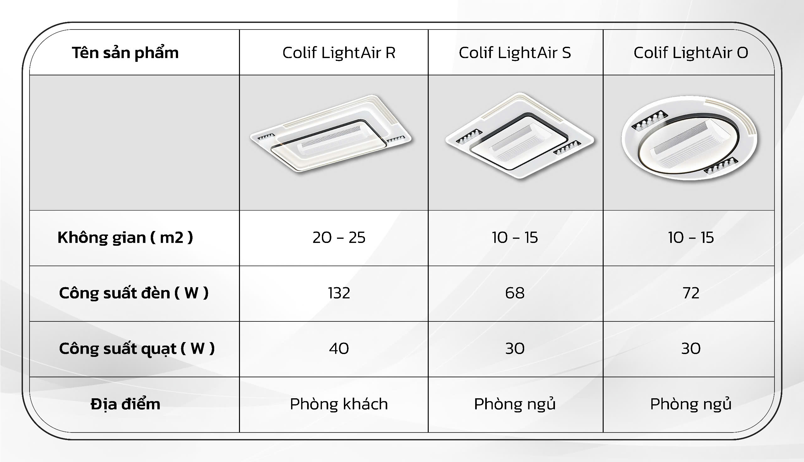 Hiện tại Colif đang phân phối 3 mẫu đèn quạt trần, gồm Light Air One R (hình chữ nhật), Light Aiir One S (hình vuông)và Light Air One O (hình tròn). Các mẫu đèn đều có tính năng như nhau và khác nhau về một số thông số kĩ thuật.