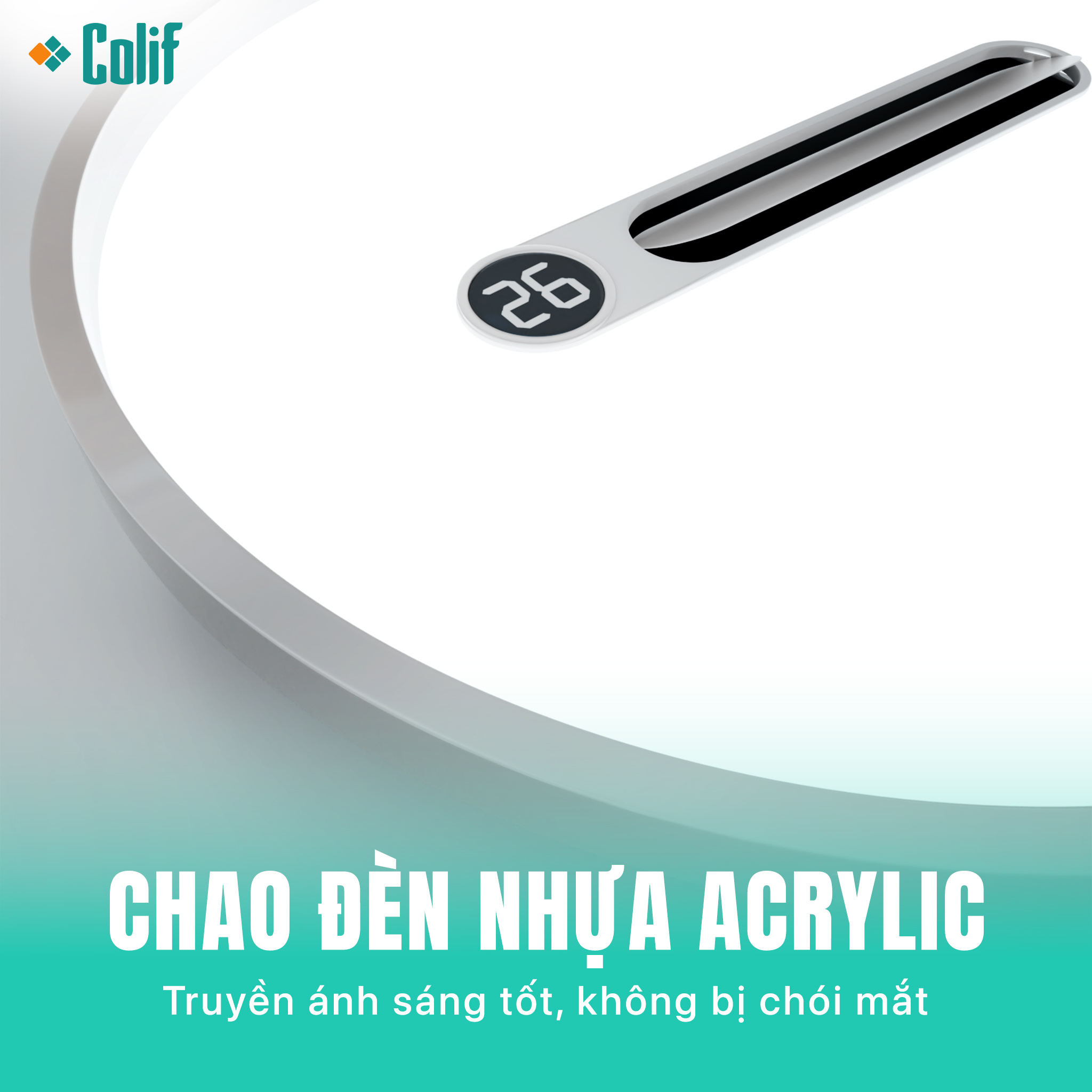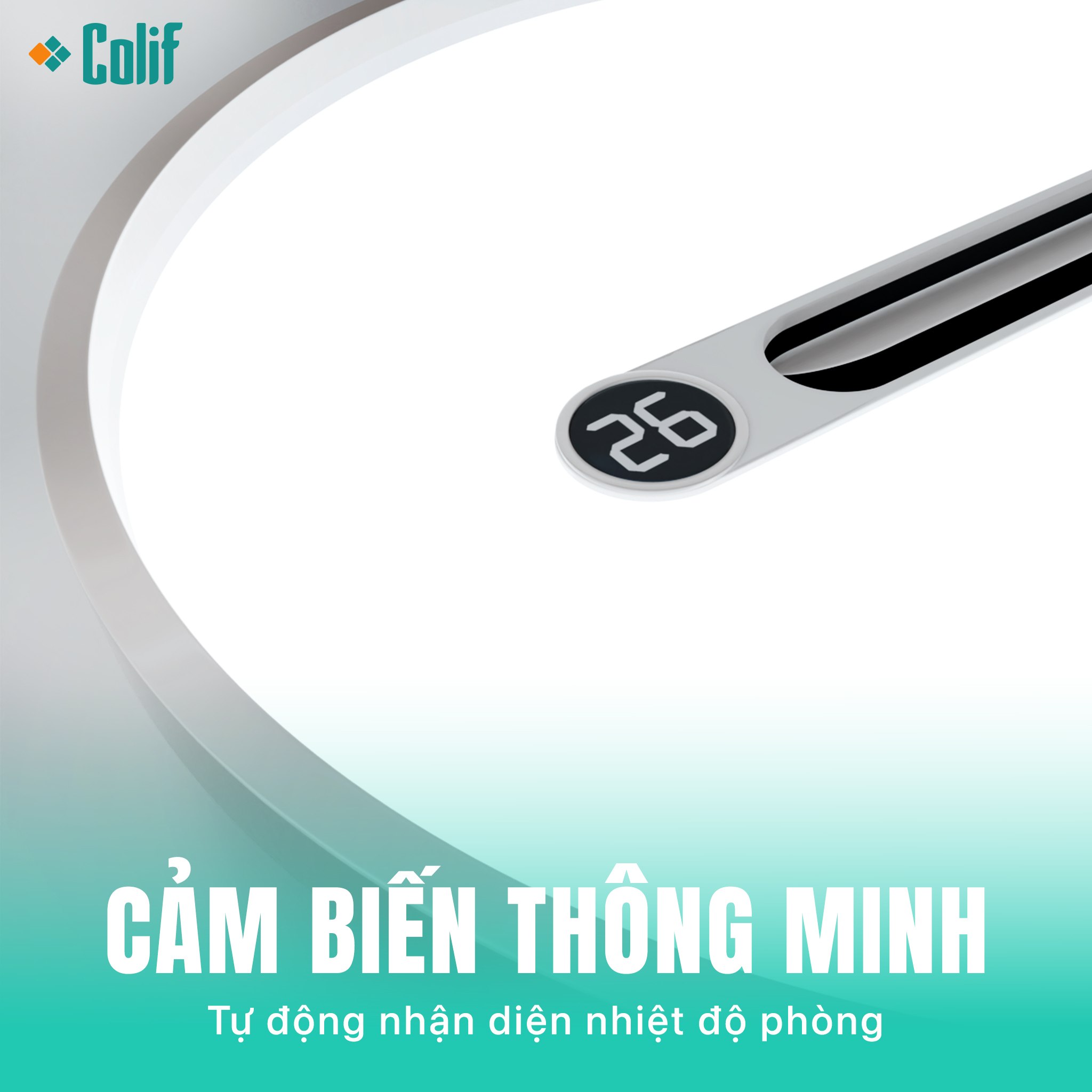 Đèn quạt Colif Light Sky được trang bị cảm biến nhiệt độ thông minh, hiển thị ngay mức nhiệt phòng hiện tại trên mặt đèn. Nhờ vậy, người dùng dễ dàng biết được môi trường xung quanh và chủ động điều chỉnh tốc độ gió bằng remote từ 1 đến 6 cấp độ sao cho phù hợp. Tính năng này mang đến sự tiện lợi và cảm giác hiện đại, khác biệt hoàn toàn so với quạt trần truyền thống.