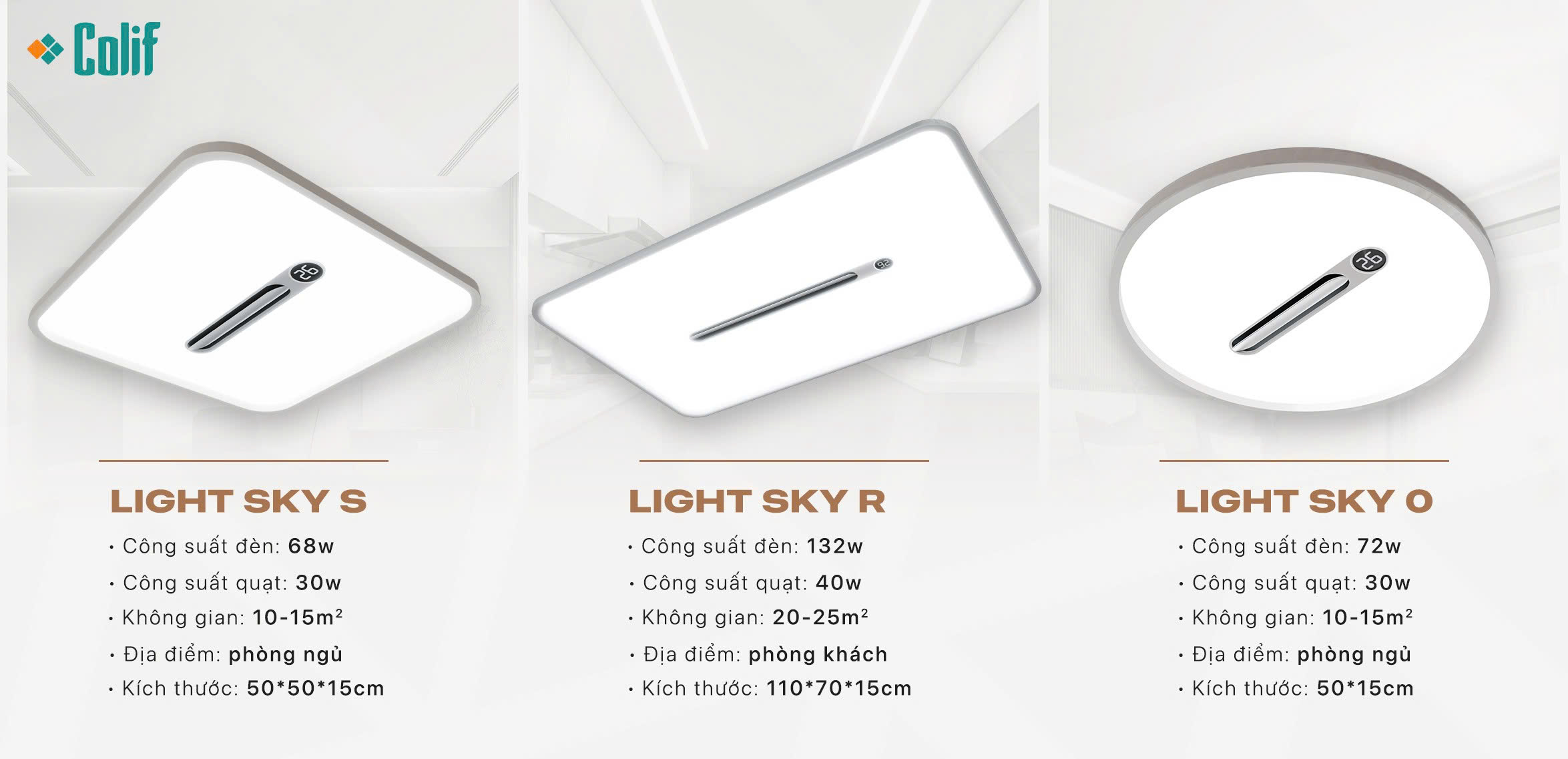Hiện tại Colif Light Sky đang phân phối 3 mẫu gồm Light Sky R (hình chữ nhật), Light Sky S (hình vuông) và Light Sky O (hình tròn). Các mẫu đèn đều có tính năng như nhau và khác nhau về một số thông số kỹ thuật.
