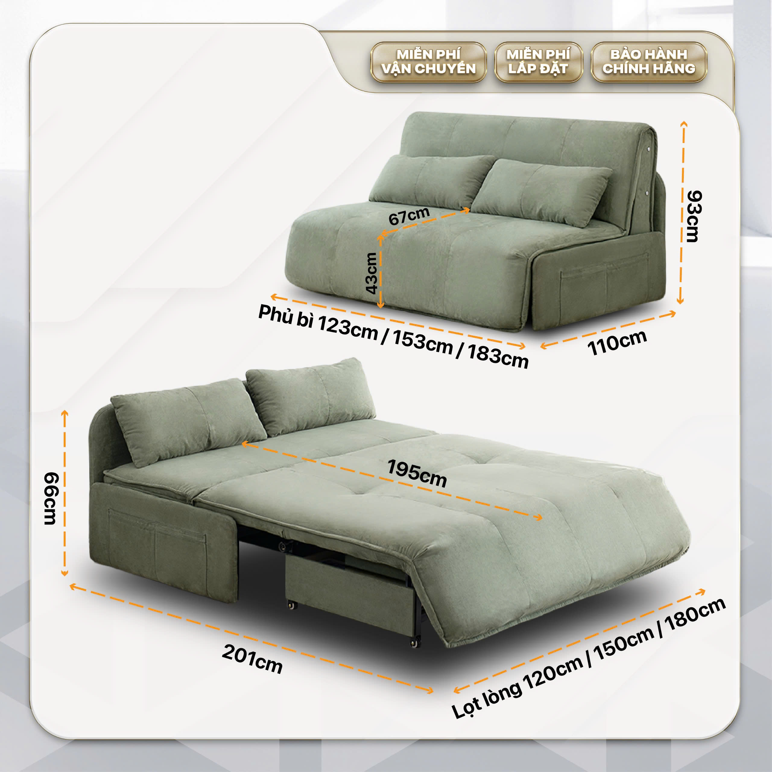 Tích hợp đa tính năng trong cùng một thiết kế duy nhất. Bạn có thể linh hoạt chuyển đổi từ một chiếc ghế sofa thành giường ngủ và ngược lại. Ngoài ra, sản phẩm còn có ngăn chứa đồ ẩn dưới giường rộng rãi và tiện lợi - giữ cho không gian luôn gọn gàng và ngăn nắp.