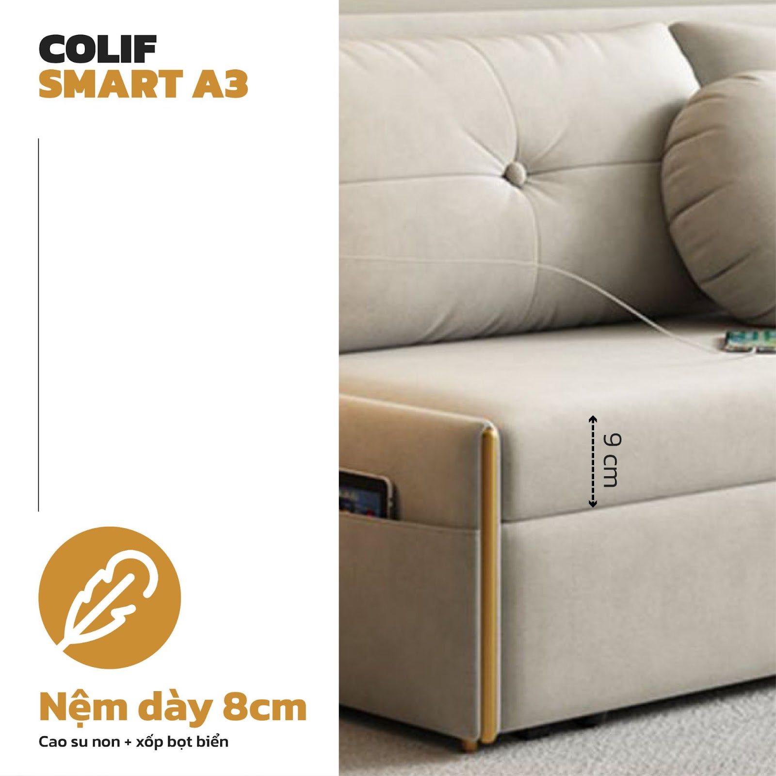 Giường sofa đa năng Colif Smart A3 có phần nệm dày 8cm, gồm 2 lớp cao su non và xốp bọt biển, có độ đàn hồi tốt và chống xẹp lún.